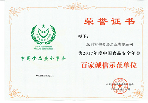 中國(guó)食品安全年會(huì)百家誠(chéng)信示范單位2017